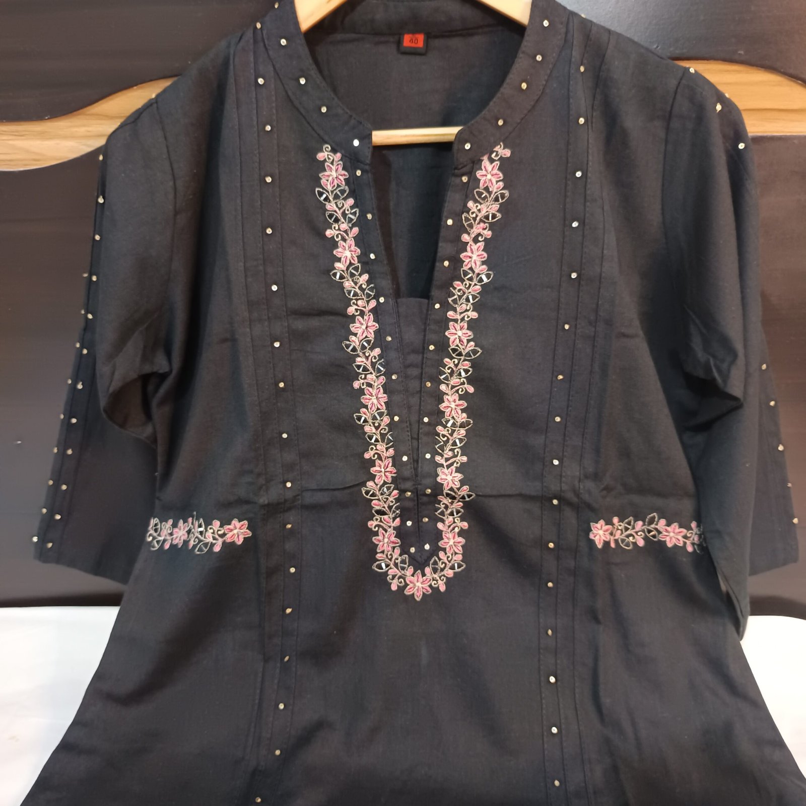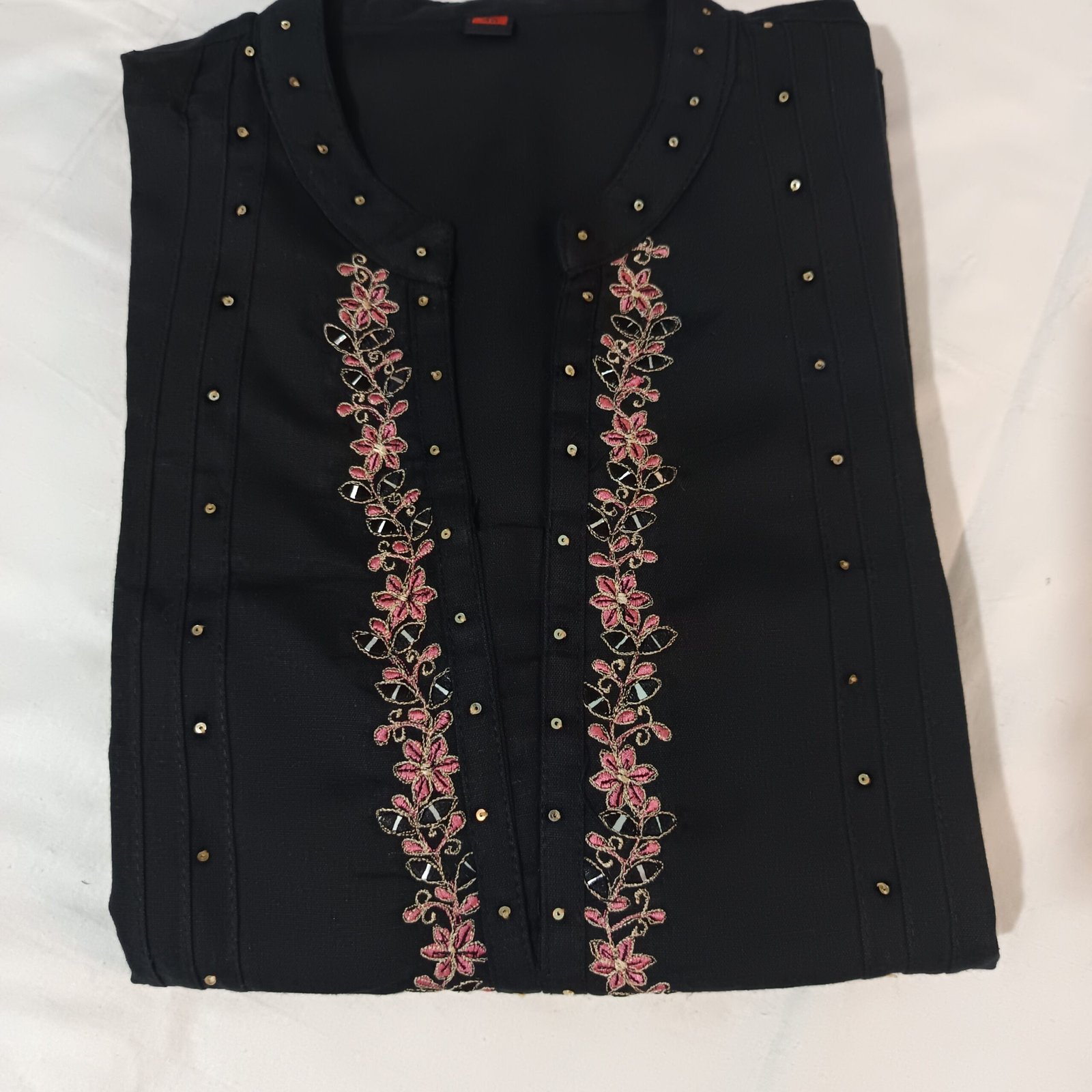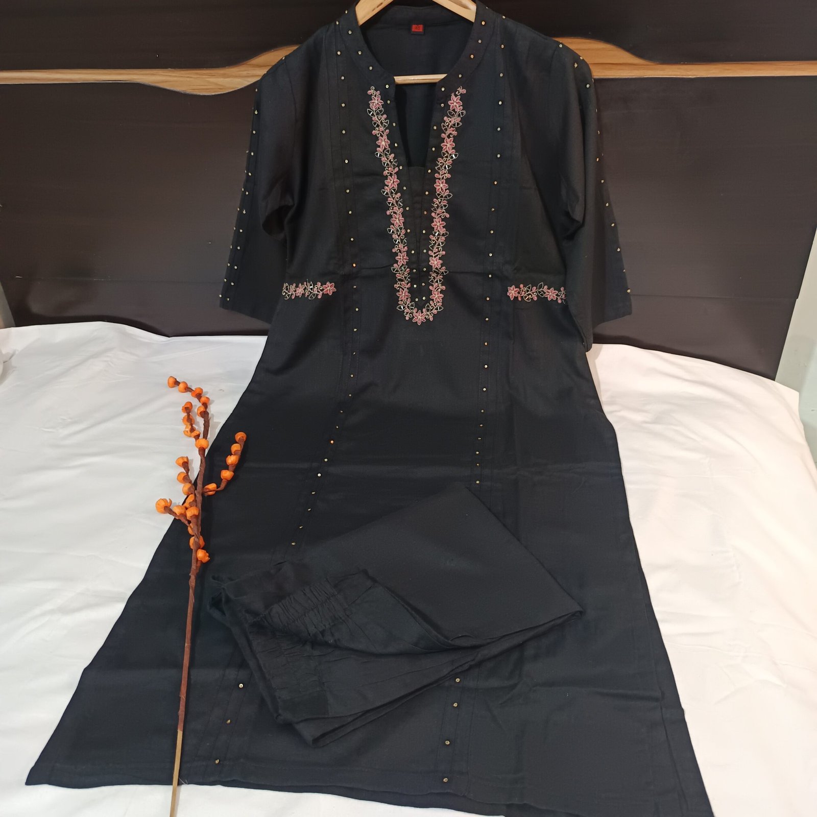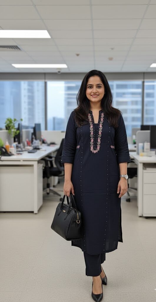 *Cotton Flex* kurti and pants with beautiful delicate embroidery on neckline and waist. Pintucks and Sequin detailings on sleeves and front. Smart comfortable office fit, you must not miss.