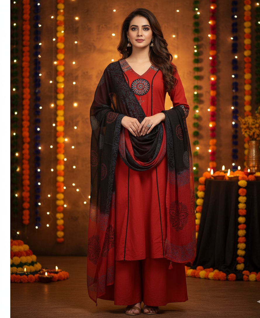 Premium red ethnic suit designed for festive and party wear