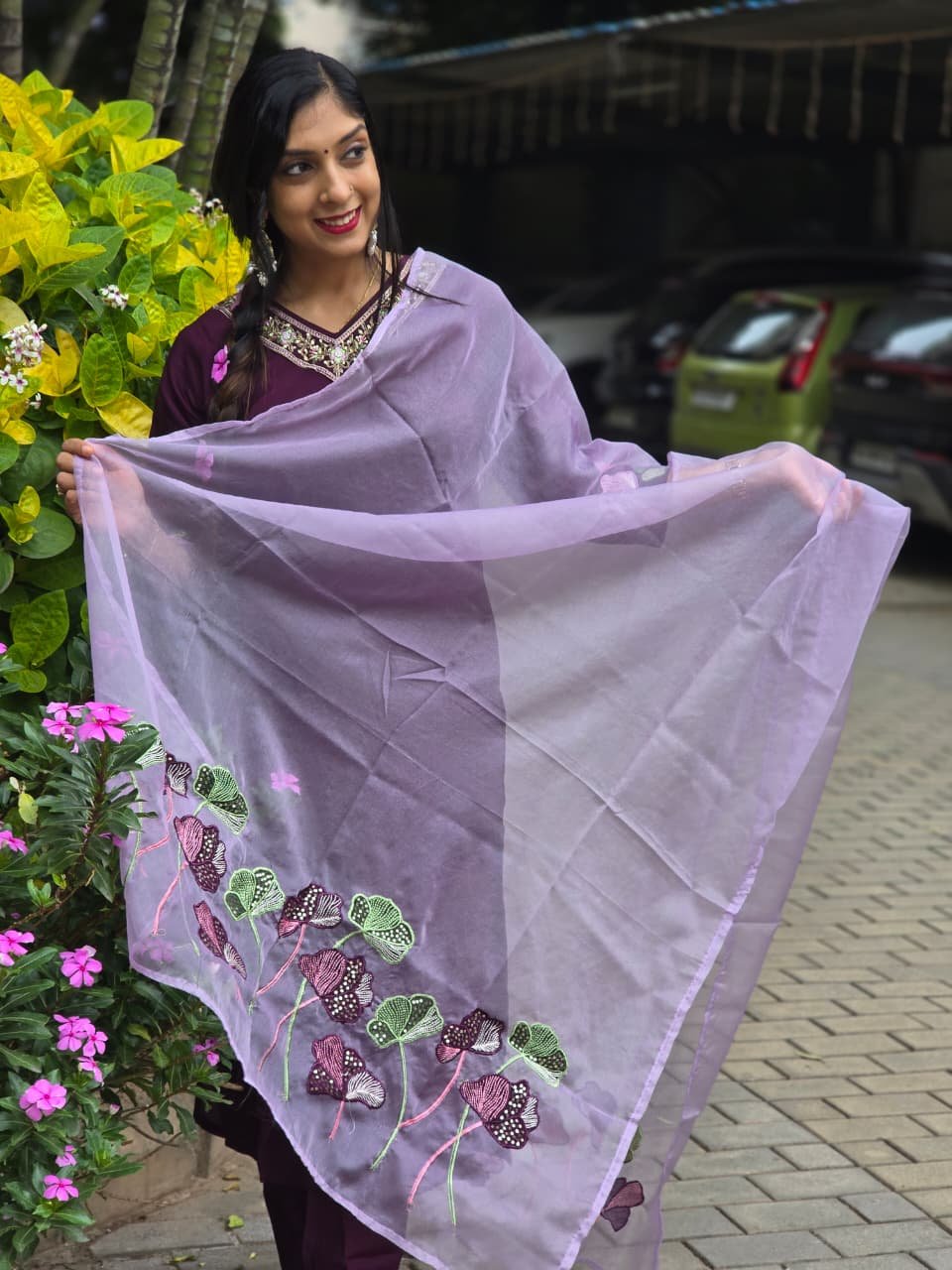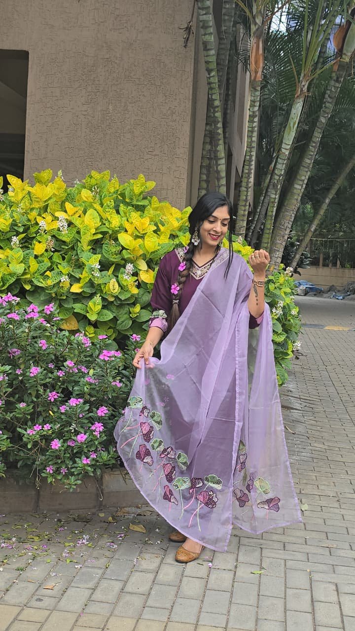 Solid Purple partywear suit in Muslin fabric that adds a subtle sheen to the attire. Paired with Lilac Organza dupatta with Applique and cutwork. Crepe Lining attached. Thread emboidery with handwork on neckline.