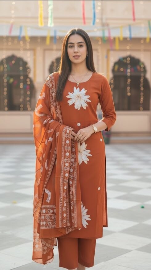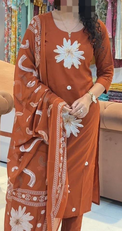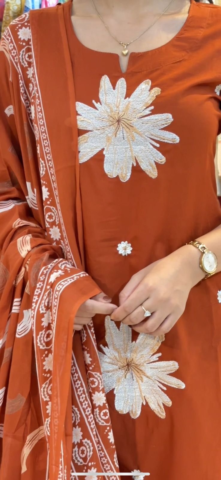 & Free ShippingPure Cotton suit with machine thread embroidery on the flowers in the front of kurta.